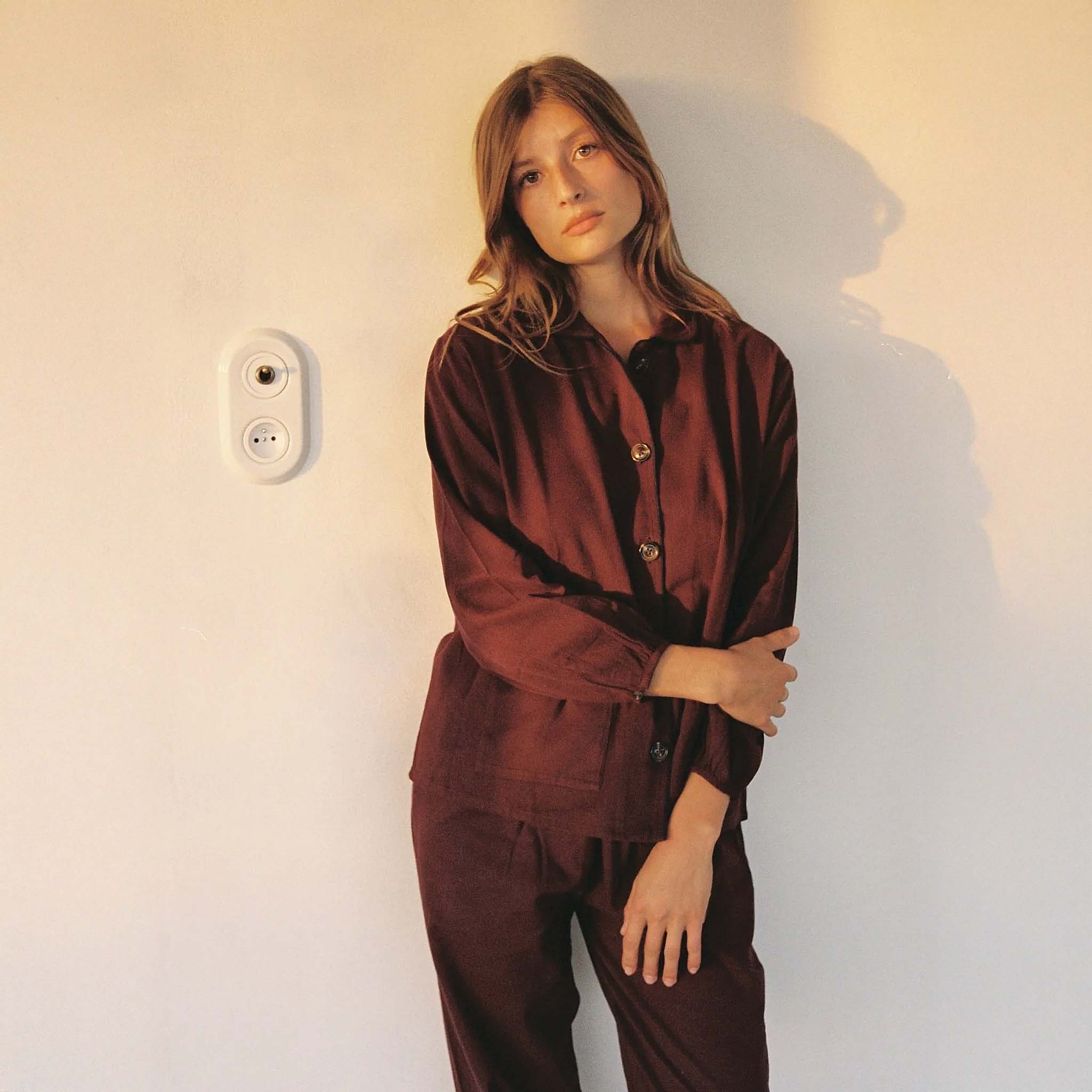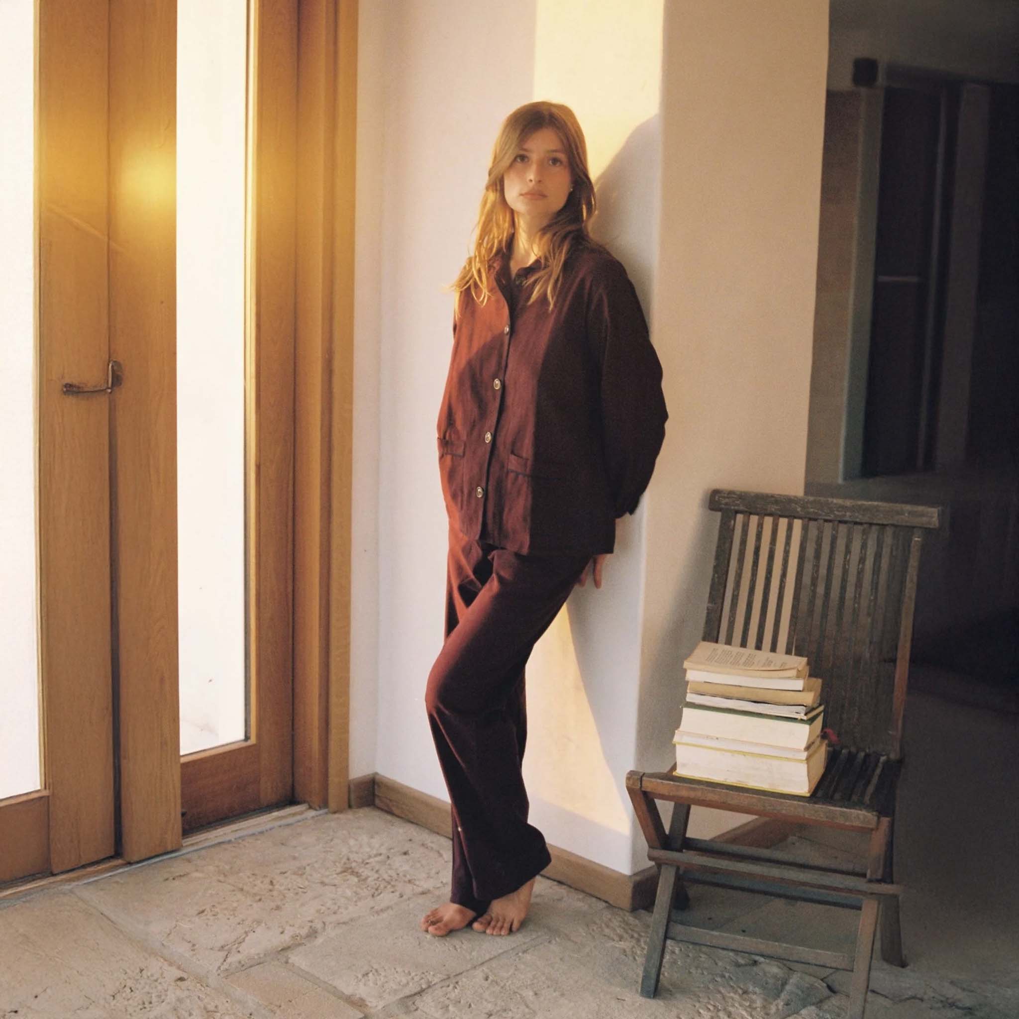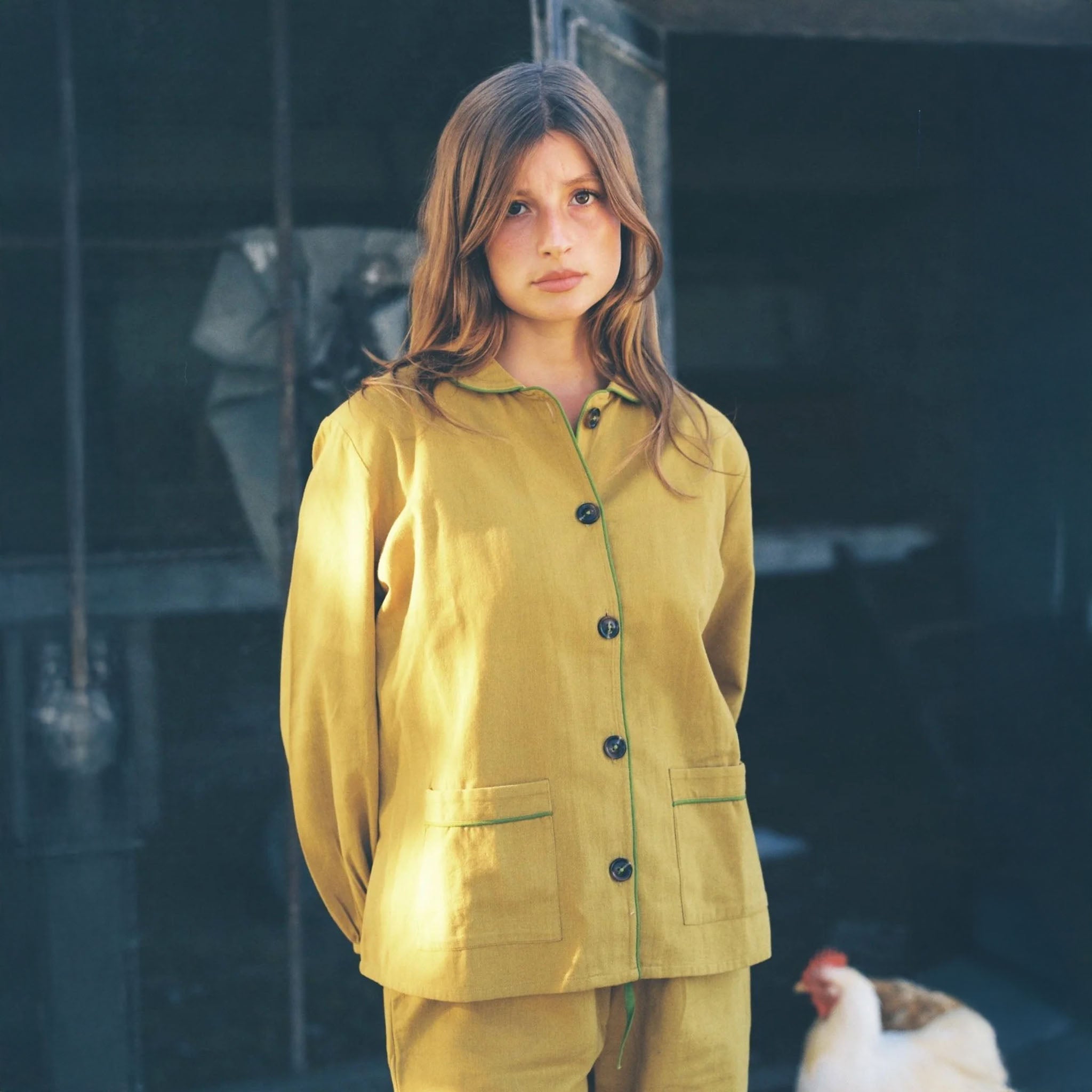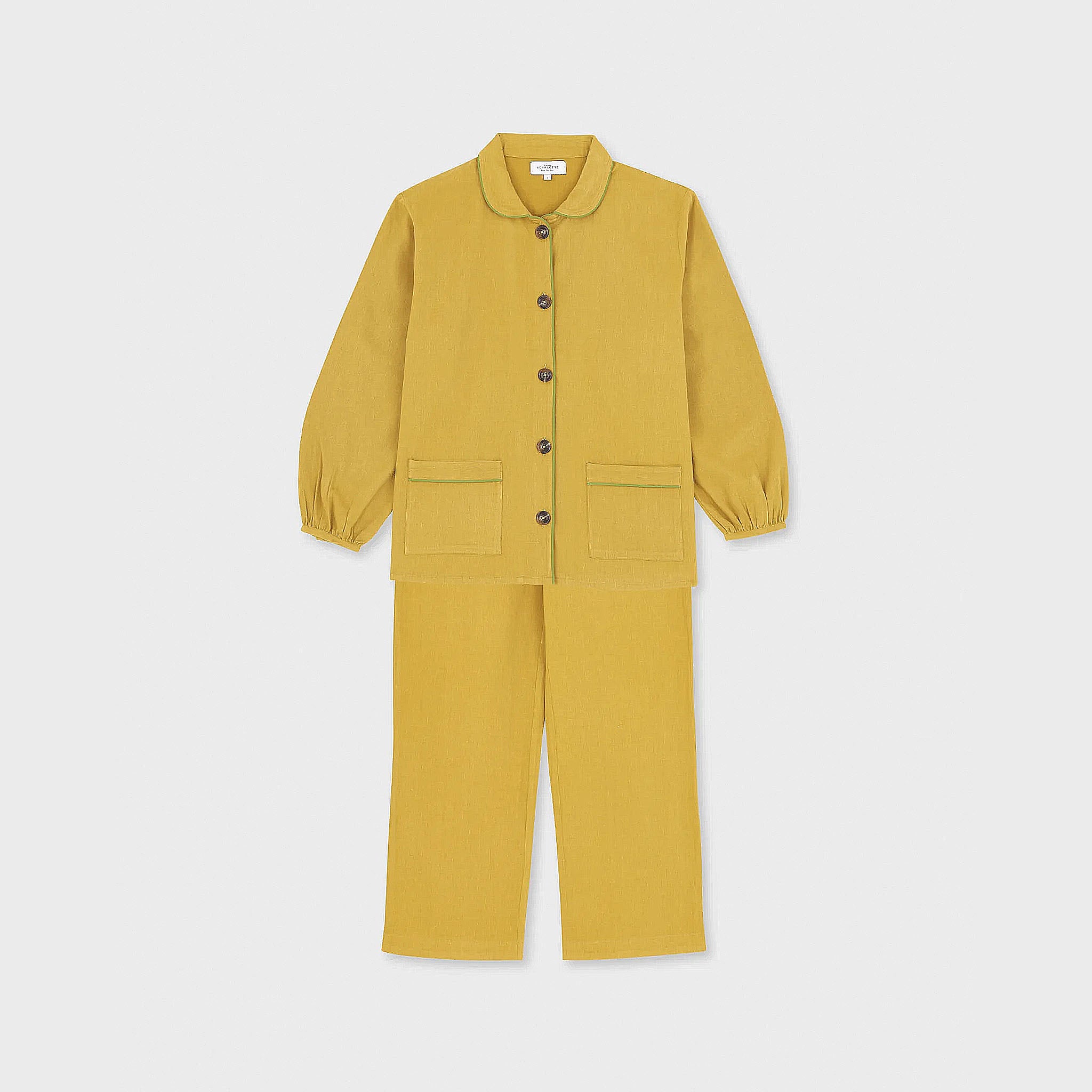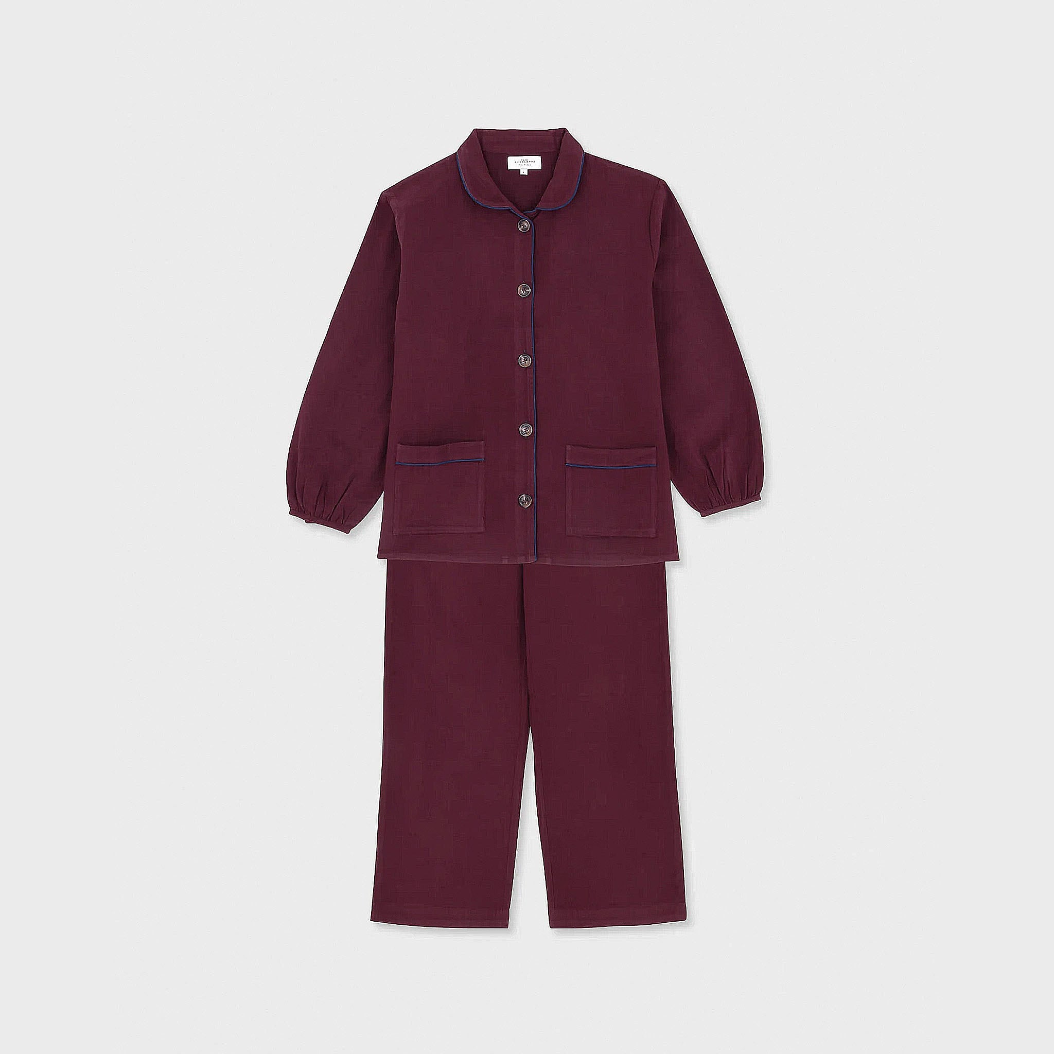 Cozy up in timeless comfort with the Claudine Pajama Set, available in two elegant colorways: Mustard and Burgundy. Made from ultra-soft flannel cotton, this set is perfect for cooler nights. The straight-cut jacket features long sleeves and charming oversized buttons, while the relaxed pants offer an elasticated waist and practical side pockets. A contrasting green bias trim adds a refined finishing touch.
