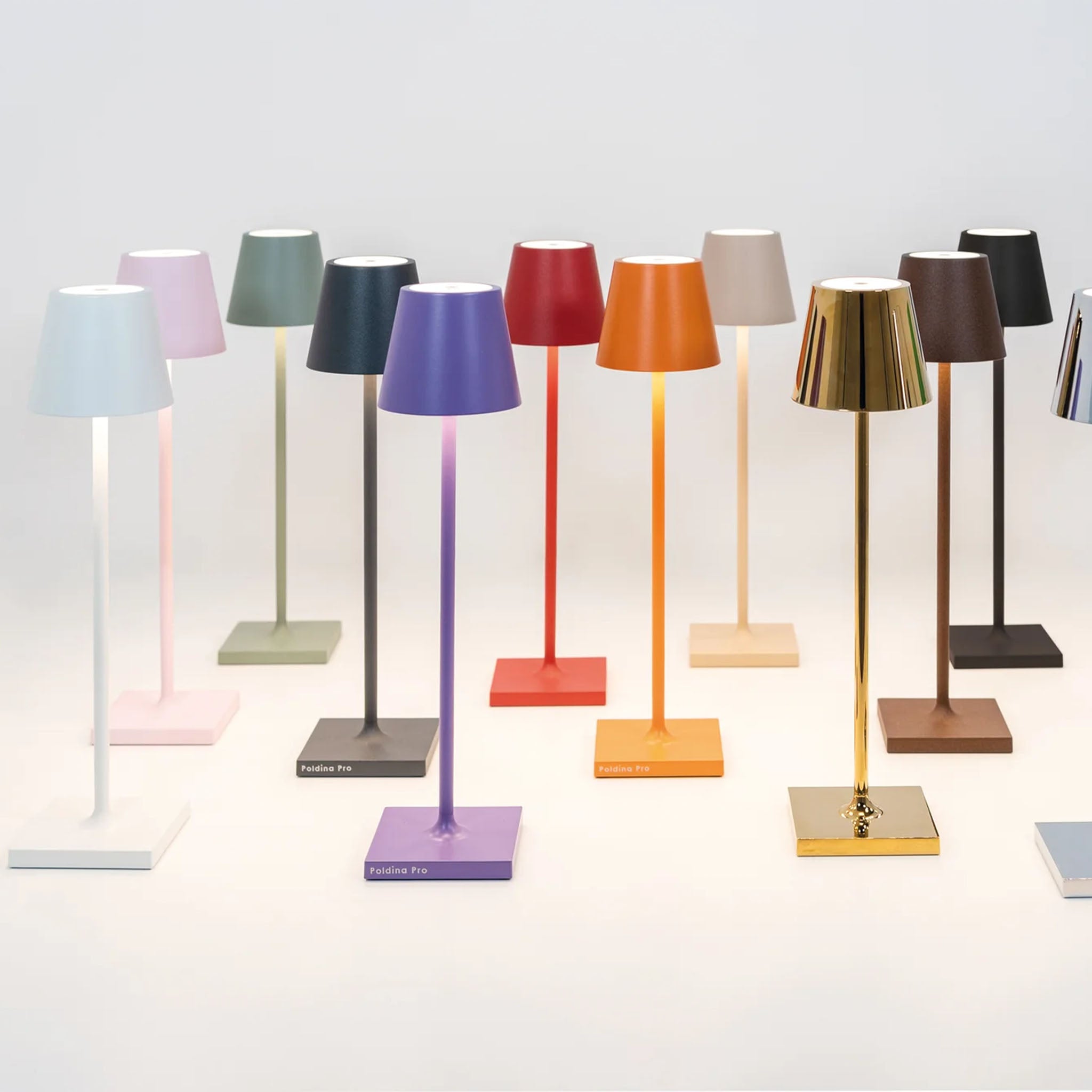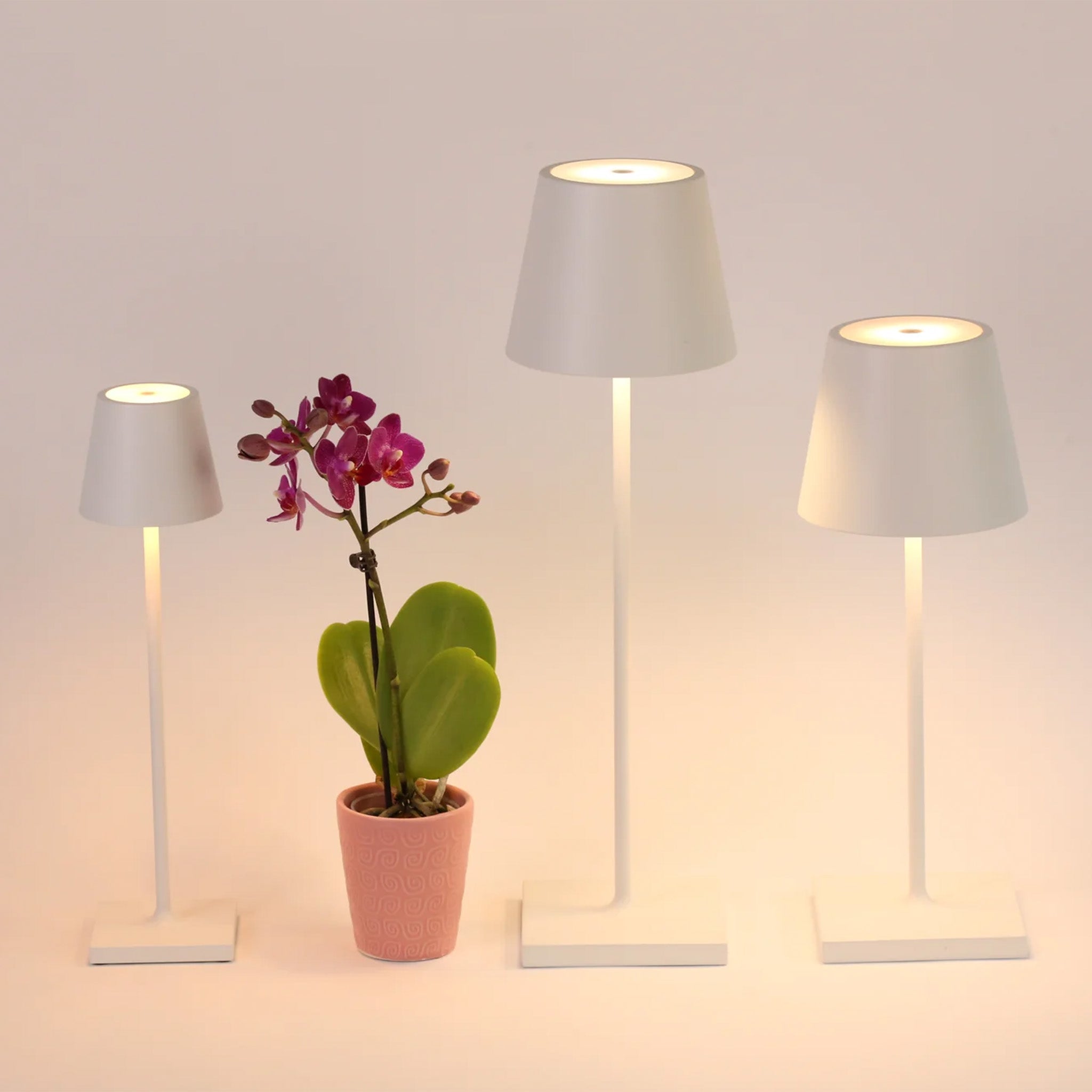 To recharge your Poldina Pro Micro lamp, plug the USB terminal on the charging base into a 5V-1A USB charging plug adaptor (not included) or a USB multi-port charging station. Place the lamp on the base. The translucent top will glow red while charging and turn green once the charging cycle is complete. A full charge takes 3-4 hours. The lamp should be removed from the charging cradle when the battery is fully charged.